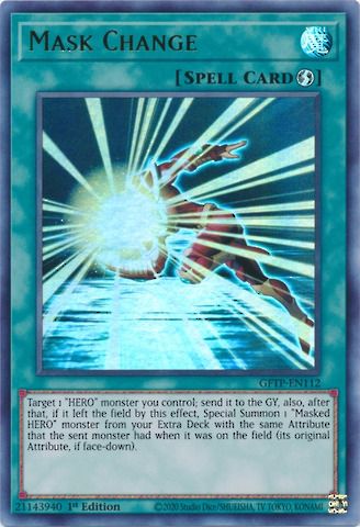 "ต่อไป ฉันจะใช้การ์ดเวทย์มนต์ชับพลันจากบนมือ! Mask Change (มาสเชน)! การนี้ทำให้ฉันสามารถเลือกมอนสเตอร์ที่มีชื่อฮีโร่ 1 ตัวที่ฉันควบคุมอยู่ โดยการส่งมอนสเตอร์ตัวนั้นลงสุสาน และเรียกมอนสเตอร์ที่มีชื่อ M-HERO (เอ็ม-ฮีโร่) 1 ตัวที่มีธาตุเดียวกันกับมอนสเตอร์ตัวนั้นจากเอ็กซ์ตร้าเด็คออกมาได้!"