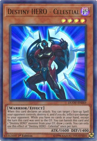 "และจากมือของฉัน ฉันขออัญเชิญ D-HERO Celestial (ดี-ฮีโร่ เซเลสเชียล (ดีไวย์กาย)) ออกมา!" ยูเฟิงใส่การ์ดลงในมือข้างเดียว ร่างมอนเตอร์เพศชายสวมเกราะสีดำสะพายแหวนเหล็กไว้ที่หลังได้ร่อนลงมาจากท้องฟ้า