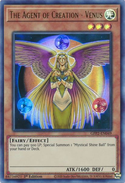 "ก่อนอื่น ฉันจะเรียกมอนสเตอร์บนมือของฉันออกมา The Agent of Creation - Venus (ตัวแทนแห่งการสร้างสรรค์ - วีนัส)!" ยูเฟิงวางการ์ด ลงบนดูเอลดิสก์อย่างแรง ท่ามกลางแสงวาบ เทพธิดาที่มีปีกคู่หนึ่งก็บินขึ้นมาในสนาม